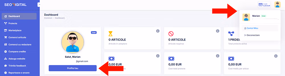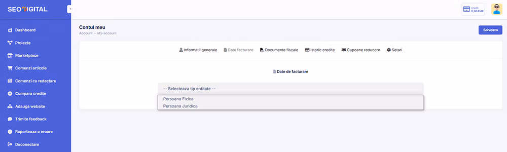 După ce ți-ai creat cont, îți recomandăm să-ți completezi profilul, inclusiv datele de facturare. O poți face aici https://app.seodigital.ro/account/my-account