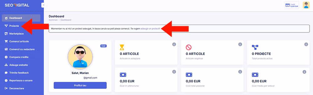Creează proiectul dând click pe linkul din bannerul ce îți apare în dashboard sau din lateral la Proiecte.