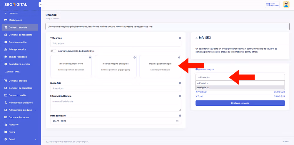 Completează datele comenzii: titlu, articol, încarcă poză ( landscape , dimensiunea ideală 1200 px ), specifică sursă foto ( proprie, freepik, etc).