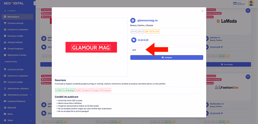 Pentru a trimite articolul bonus spre publicare, mergi în marketplace https://app.seodigital.ro/shop/marketplace și în butoanele de filtre, dă click pe PRO. O să-ți apară publicățiile pe care poți publica, alege una din ele și da click pe Detalii.